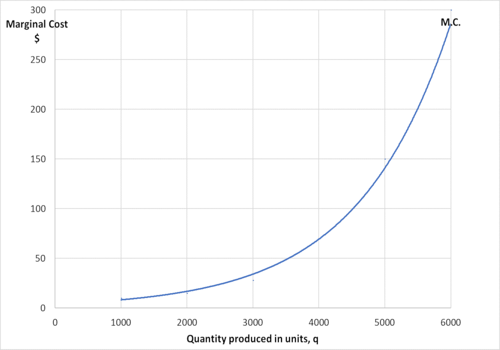 Marginal cost(M.C.) is the cost incurred in producing one additional unit of output. It is the addition to Total cost(T.C.) for producing 1 additional unit of output. The law of diminishing returns gives us that the marginal cost increases at a faster pace. Why?