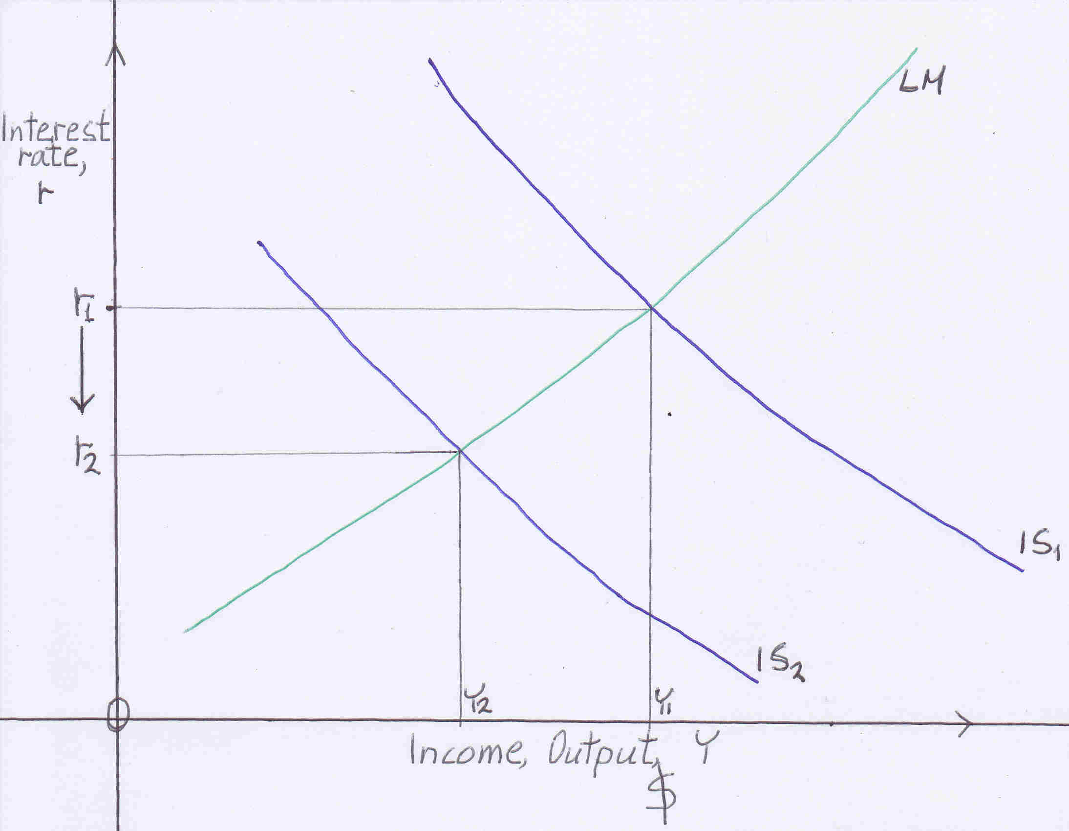 Government spending is reduced consequently aggregate demand is reduced, shifts down reducing Y to Y3.