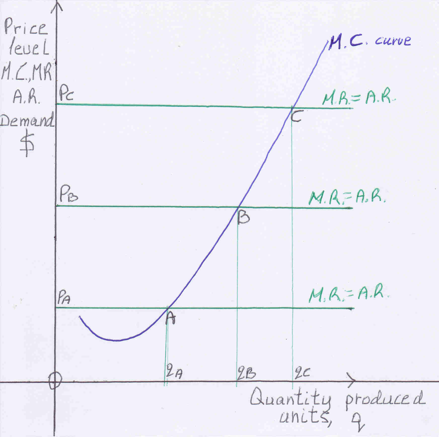 As explained previously the perfect competitive firm will produce that output where M.R.=M.C. to maximize profits. The M.R. curve is the same as the A.R. curve which is the demand curve and it is parallel to the x-axis and to other demand curves. The points of intersection between M.R. curves and the M.C. curve describe the supply curve for example at PA it will produce qA, at PB it will produce qB, at PC it will produce qC but these points as it is illustrated is the M.C. curve: points A, B, C.