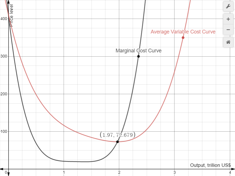 The a.v.c.c. is as in the graph below (red curve). We find the point of intersection of the two curves and indeed is the minimum of a.v.c.c. where the supply curve for pc starts: it is output=1.9704.