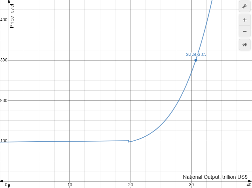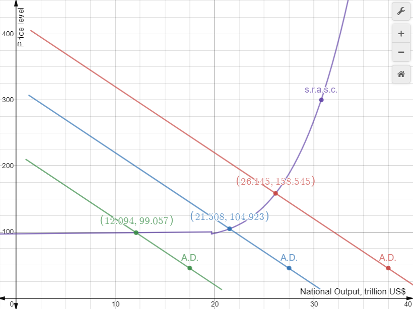 When aggregate demand, A.D. increases: shifts to the right, the increase in price is enough at low values of output. For example, in the graph from A.D.green to A.D.blue the price went from 99 to 105: change 6. Then by the same amount of increase in A.D. from A.D.blue to A.D.red the price went from 105 to 159: 54. This is because the supply curve as output increases becomes steeper. At full employment output (supply curve is vertical) an increase in A.D. causes high inflation and zero economic growth(annual percentage increase of real National Output, Y). The shift of A.D.green to A.D.blue Y increased (in trillions) from 12 to 22: 9. From A.D.blue to A.D.red Y increased from 22 to 26: 4. The above paragraph is merely an example to demonstrate the effects of changes in A.D. This is what is happening to the US economy right now: inflation is increased, economic growth is reduced.