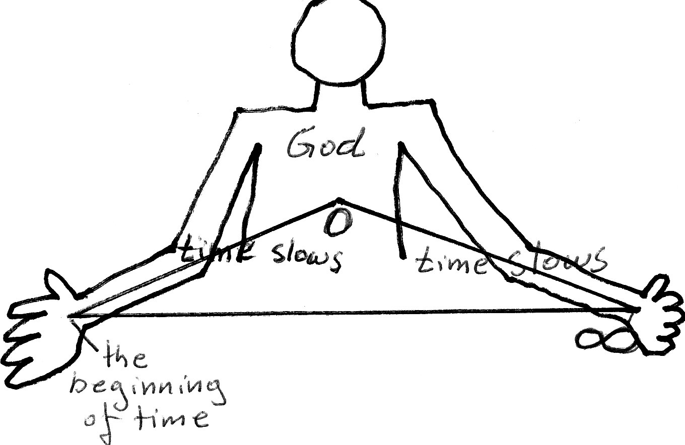 Now, we reach God the time when we are with God slowed to zero, 0. Here when people on earth look at God they see Him immovable and they see the clock with God immovable. The needles of the clock are still. From where God is we look at the earth and He sees the clock moving and people moving with infinite speed. Where God is the time is 0 relative to earth. If we are with God at this point (time is zero) and we look at the earth the earth will be 1/0 faster than the time where we are with God 1/0=∞ (∞=infinite) faster. Infinite times faster. At the time 0, where God is He has seen the universe history from 0 to ∞, God has seen it all: people and clocks moving with infinite speed covering millions, billions, infinite years. God has seen all history from 0 to ∞. God knows the future. He has seen it. He knows it all. That is if He is at point where time is zero relative to earth. Where time stopped.